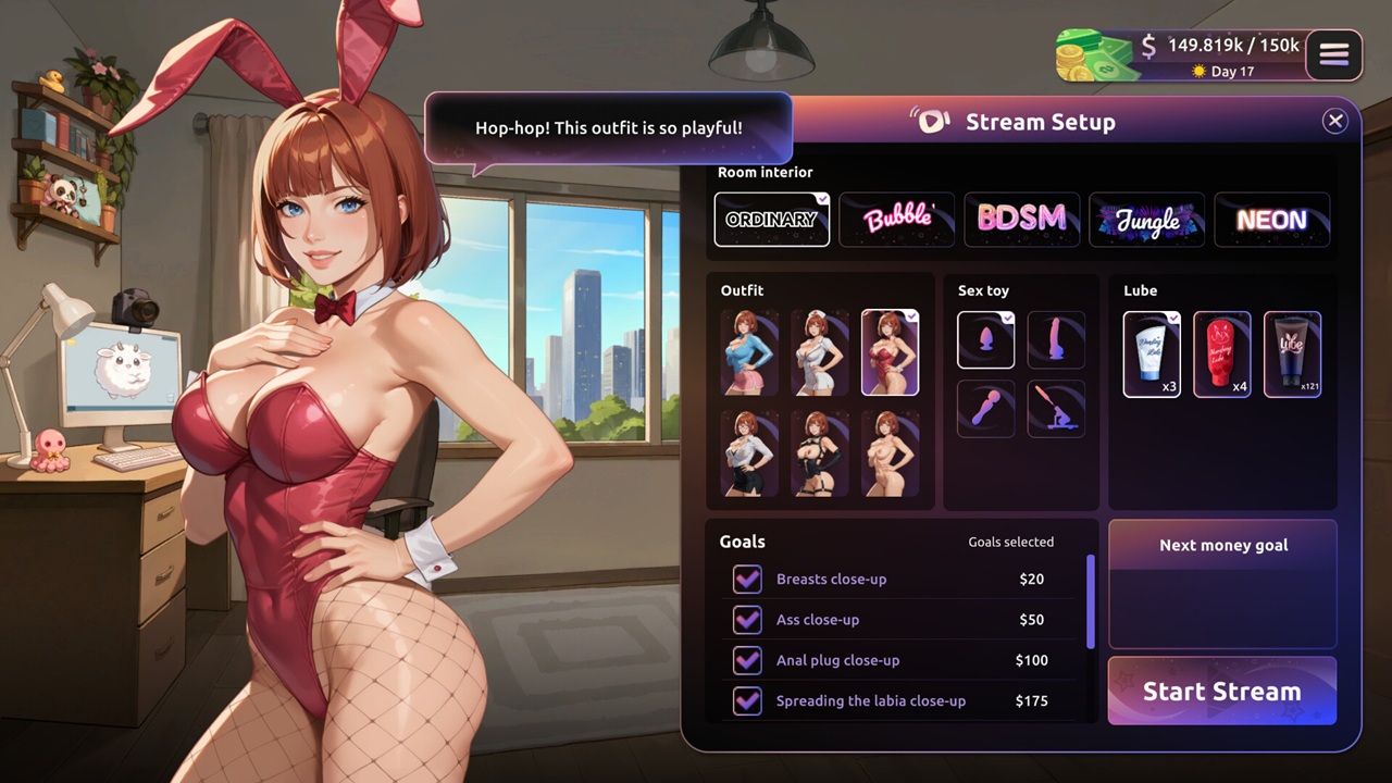 Визуальное исполнение и графическая часть игры выполнены в качественном стиле современной аниме-анимации с акцентом на выразительную мимику и яркие спецэффекты. Студия Lewd Star уделила огромное внимание интерфейсу, который имитирует реальные стриминговые сервисы с бегущими строками чата, всплывающими уведомлениями и динамическими шкалами популярности. Графика радует плавной анимацией героини (Live2D), что делает её присутствие на экране живым и эмоциональным. Освещение и цветовая палитра меняются в зависимости от тематики стрима — от неонового киберпанка до уютного «пастельного» блога, создавая нужное настроение у игрока. Звуковой дизайн дополняет картинку энергичным J-pop саундтреком и характерными звуками уведомлений, которые вызывают азарт при каждом успешном действии. Особое внимание уделено озвучке персонажей, которая придает глубину диалогам и делает личные моменты общения с героиней более интимными и запоминающимися. В итоге игра становится не просто симулятором, а стильным цифровым высказыванием о современной поп-культуре, предлагая игроку увлекательный опыт создания интернет-звезды с нуля, где техническое изящество картинки сочетается с ироничным и злободневным сценарием.